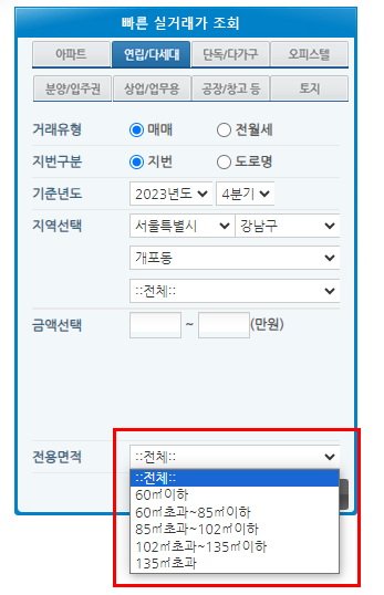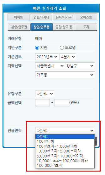 마지막으로 면적을 선택하면 되는데, 공급면적 기준입니다. 연립/다세대, 상업/업무용, 토지의 면적의 기준은 각기 다릅니다. 주거용은 흔히 알고 있는 국민평수가 눈에 띄고, 업무용인 경우에는 특정한 구간으로 나뉘었으며, 토지의 경우 지목을 먼저 파악해야 합니다.