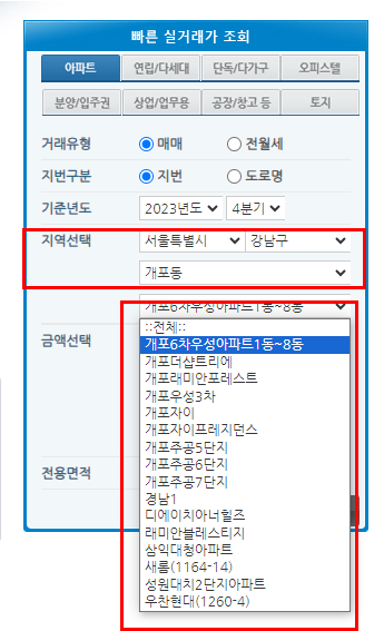 지역과 구, 동을 선택하면 해당 지역에 속한 부동산 목록이 바로 확인됩니다. 강남구 개포동을 선택하면, 유명한 단지들이 줄줄이 나오는 것을 알 수 있습니다. 아파트와 연립다세대를 선택했을 때의 화면입니다. 확인되는 목록이 다름을 알 수있습니다.
