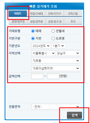 분기마다 확인해야 한다는 점은, 특정기간동안의 자료는 확인이 어렵다는 단점이 있습니다. 만약 23년 1년동안 특정 아파트, 특정 평형수의 거래가가 알고 싶다면, 아래와 같은 방법으로 확인할 수 있습니다.