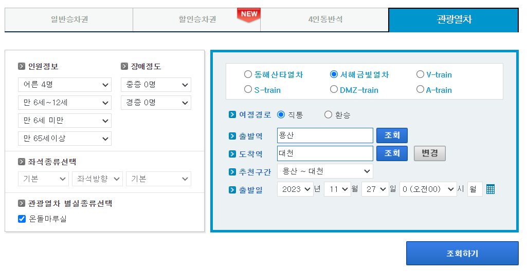 렛츠코레일의 [승차권 예약 렛츠코레일] -> [관광열차] 에서 [서해 금빛열차]를 선택합니다. 홈페이지에 접속을 하게 되면 인원정보 및 온돌마루를 선택하도록 되어 있습니다. 서해 금빛 열차 선택 후, 관광열차 별실 종류 선택에서 온돌마루실을 꼭 클릭해 주세요. 온돌마루실 클릭은 왼쪽 하단에 있습니다. 코레일에서 추천하는 구간은 [용산 ~ 군산] [ 용산 ~ 대천] [ 용산 ~ 장항]입니다. 인원은 총 3명이 최소로, 어른 어린이 구성의 최소 조건은 없습니다.