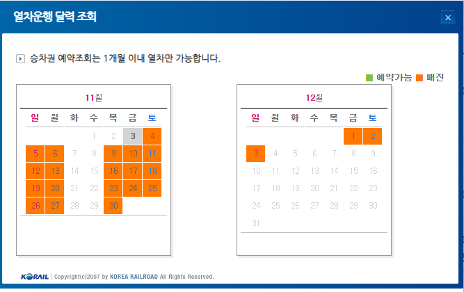 열차운행 달력에서 녹색이 예약 가능하고, 주황색은 매진입니다. 1달 전에 예약 가능하니 요일 확인하셔서 예약해보세요.