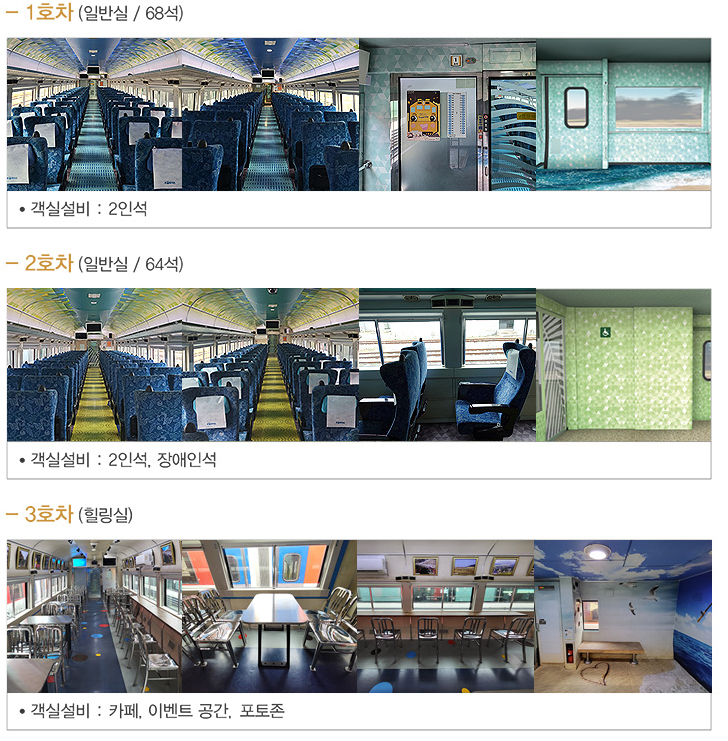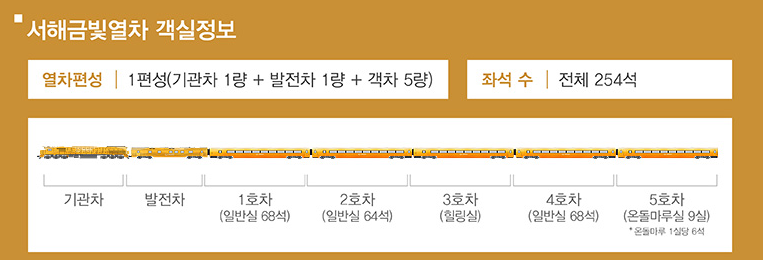 서해금빛열차는 5량으로 1,2,4호는 일반 좌석입니다. 좌석은 새마을호보다 넓은 것 같지만 ktx에 비해 편하지 않습니다. 다만 콘센트가 각 좌석마다 있어서 핸드폰이나 노트북을 이용하기에는 어렵지 않을 것 같습니다. 3호차는 카인데 아직도 운영중단중에 있습니다. 마지막 5호차가 특실인 온실마루 열차입니다. 온돌마루실은 총 9개실이 운영중에 있습니다(좌석정보는 하단에 더 있습니다.)