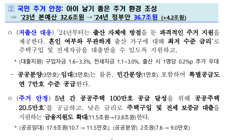 저출산을 극복하기 위한 보금자리 지원 규모는 27조로 발표되었습니다. 무주택자들이 즐겨 찾는 특례 보금자리론은 39조인데, 27조 면 꽤 큰 규모라고 볼 수 있겠습니다.