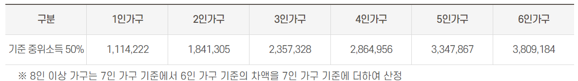 2024년 가구별 기준 중위소득 50% 이하여야 하며, 자산도 얼마나 되느냐에 따라 대상에서 탈락될수도 선정될 수도 있습니다.